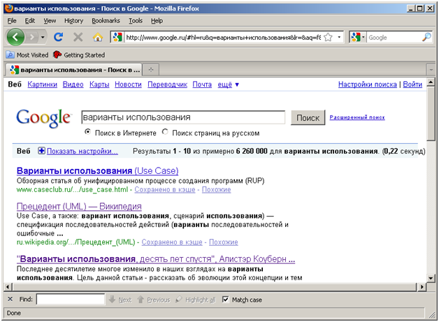 4. Система находит документы, содержащие данное слово, и выдает их пользователю в виде списка. Список упорядочен по релевантности. Список выдается страницами по 50 результатов. О каждом результате сообщается название документа, цитата из документа, содержащия выделнное слово для поиска и индекс соответствия.
