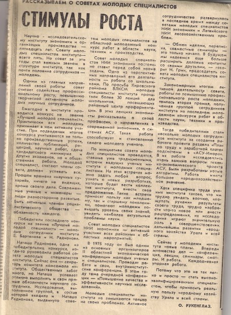 Через некоторое время в НИИЭкономики пришла Наташа Радионова (мы с ней были хорошо знакомы по УПИ, там в СНО вместе занимались, училась она на курс младше). И у нее уже была специальность «Экономика и АСУ». Семен Фридрихович приложил усилия, чтобы Наташа попала к нам в АСУ 1. И мы снова стали вместе работать – и в проектах, и в Совете молодых специалистов. Поэтому получилось очень естественно, что когда я пошла в дительный отпуск в начале 1974 года, председателем этого Совета стала Наташа. Пока я «отдыхала» (поднимался сынок), был создан и районный Совет молых ученых и специалистов, Радионова в него вошла.