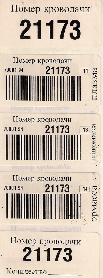 Забор крови происходит в специальные пластиковые пакеты (когда-то были бутылки, но мы их к счастью не застали). На этих пакетах их производитель размещает этикетку, которая не только несет информацию о самом пакете, но и служит своеобразной «заготовкой» для этикетки продукта крови.