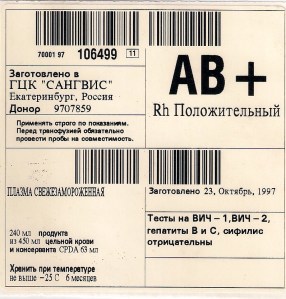 Место заготовки крови и идентификатор донора перенесены в центр этикетки. При этом ГМПО превратилось за это время в ГЦК, фамилия донора заменена на его код в системе (в интересах конфиденциальности при трансфузиях). Что было важно — вынесен на печать текст о проведенных тестах на инфекции. Ну и еще небольшие изменения.