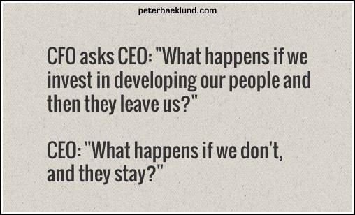 Текст на слайде: CFO спрашивает CEO: «Что будет если мы вложимся в обучение наших людей, а потом они уйдут от нас? CEO отвечает вопросом: «А что будет, если мы их не обучим, а они останутся?»