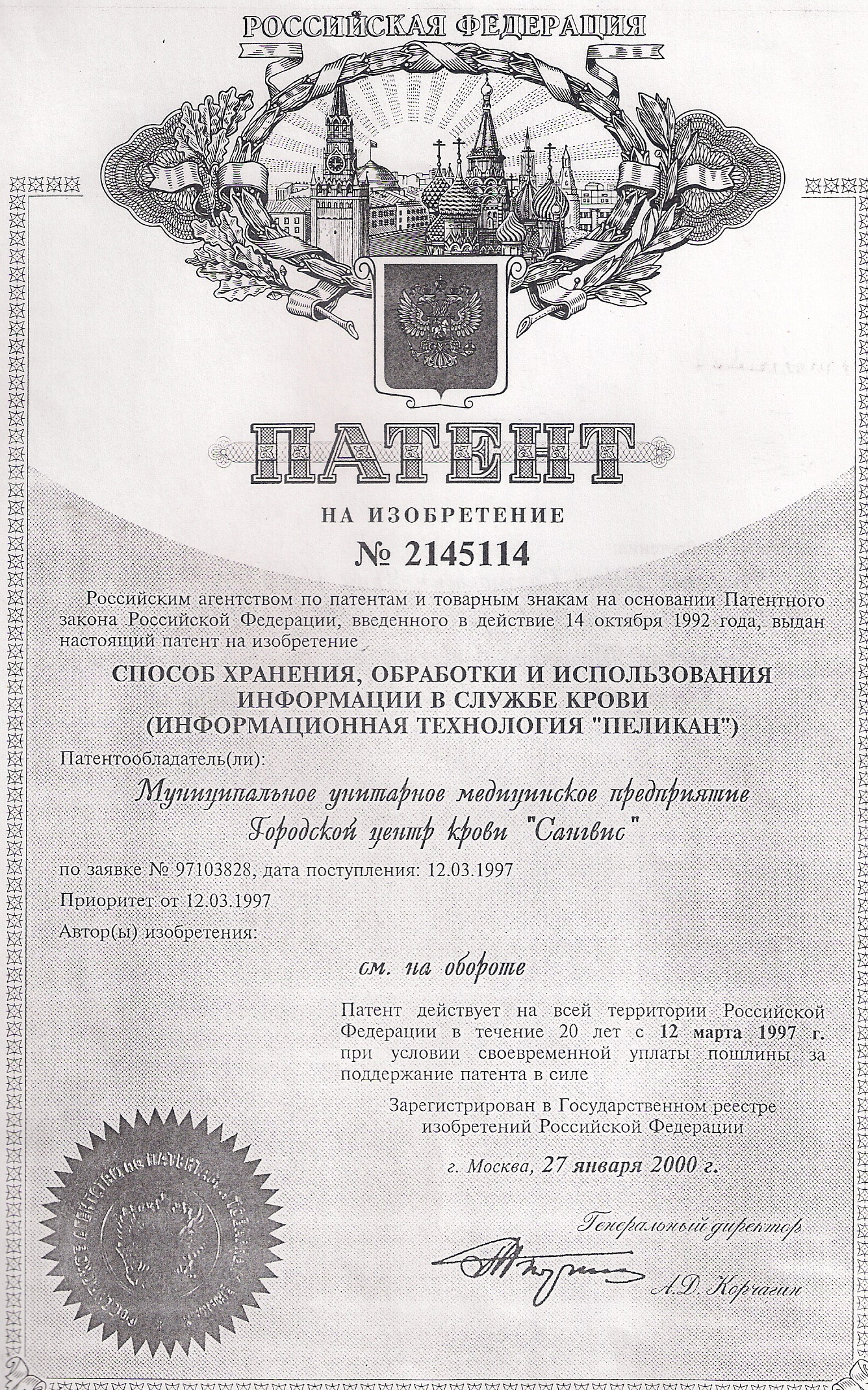 «Комплексная Информационная технология процесса заготовки и переработки крови «ПЕЛИКАН»», которая в итоге стала: Патент на изобретение № 2145114 «Способ хранения, обработки и использования информации в службе крови» (информационная система «ПЕЛИКАН») Зарегистрирован в Государственном реестре изобретений РФ Москва 27 января 2000г.